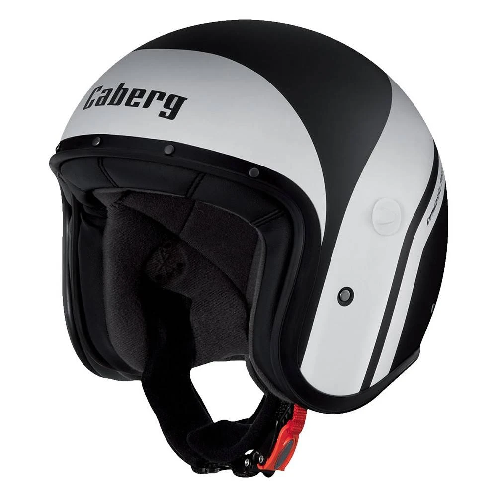 Caberg carefully focused on refined materials and key features all made in Italy such as the five rivets on the rim, the steel air intakes on the neck device, leather details, and the goggles holder with serigraphy. Moreover, during winter time or long ride routes, FREERIDE can be used either with a long clear visor easy to mount included in the helmet box, or with Caberg vintage goggles, available as spare part, for custom bike riders.