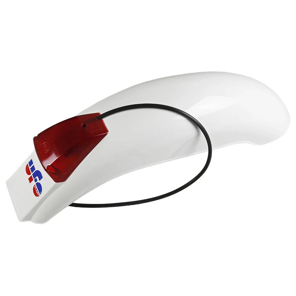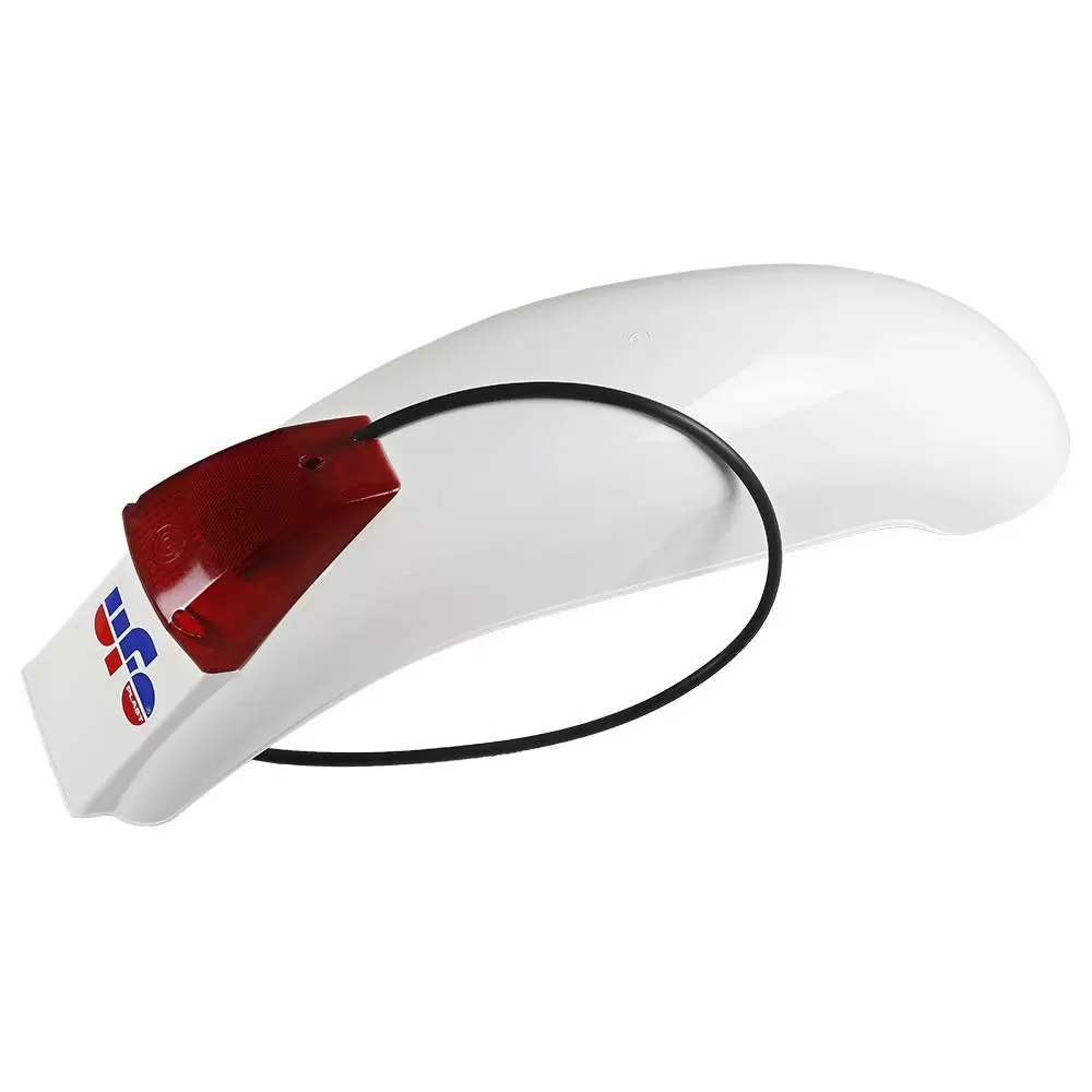 Rear fender with light (ME08031) by UFO Plast®. Expertly crafted from high-tensile plastic, this top-grade UFO product provides superior quality and dependability. It has already cut-out openings to ensure quick and easy installation. Better still, this product will enhance the appearance of your bike, giving it a chance to look unique and stylish.