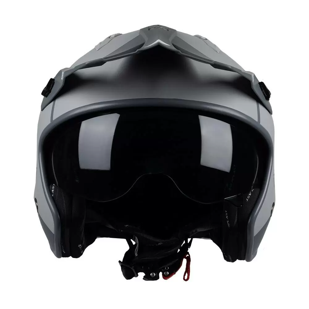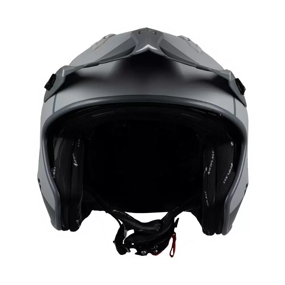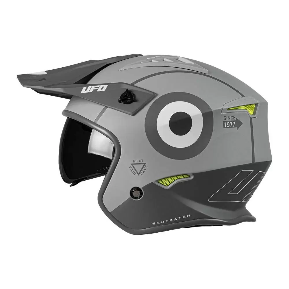 Sheratan Jet Open Face Helmet by UFO Plast®. The Sheratan Jet motorcycle helmet is a perfect helmet for trials riders or those who commute by scooter or motorcycle. The helmet has both an integrated sun visor and a helmet peak that helps protect your eyes from the sunlight. It is then characterised by multiple ventilation points to ensure efficient circulation of air within the helmet and maximise the rider’s experience. It is possible to remove the interior and wash it so that the interior of the helmet stays fresh. ECE 22.05 approved. Weight: 1050 G +/- 50 gram.