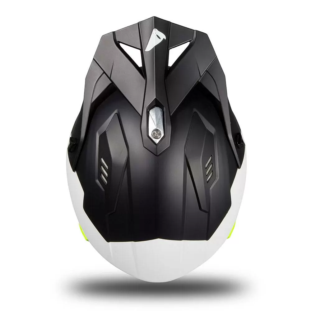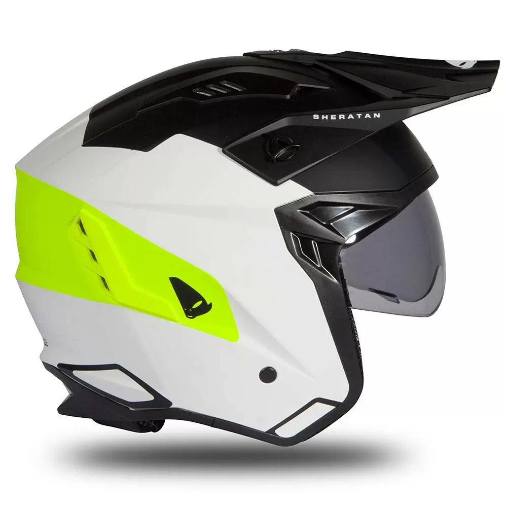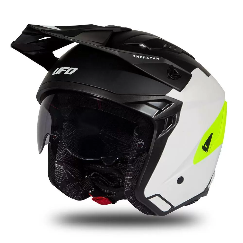 UFO Sheratan Jet Open Face Helmet in White Black Neon Yellow Matt. The UFO Sheratan Helmet starts with a lightweight shell. Add a built-in, drop down inner sun shield. Build the rich comfort padding out of hypoallergenic and breathable materials and add a built-in ventilation system to allow fresh air to pass through the material, keeping you cool and dry.